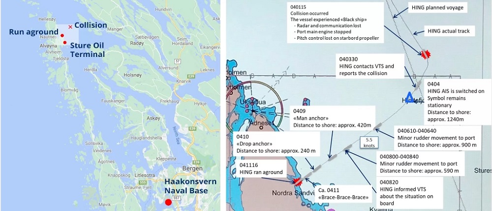 La HING bajaba por el fiordo a una velocidad de 17-18 nudos y no transmitía su nombre ni su posición en el AIS. El Servicio de Tráfico Marítimo de Fedje (VTS), que gestiona los movimientos de la navegación en la zona, fue notificado de la llegada de la fragata una hora y 23 minutos antes de la colisión, pero el operador no logró registrarla en el sistema de seguimiento. El Sola TS avisó al VTS cuando salió de la terminal petrolera, pero el operador del VTS se olvidó de la fragata y en un principio no hizo nada. El petrolero mostraba las luces de navegación estándar, pero también tenía encendidos potentes focos para ayudar a la tripulación a trabajar en la cubierta, como era su práctica habitual.