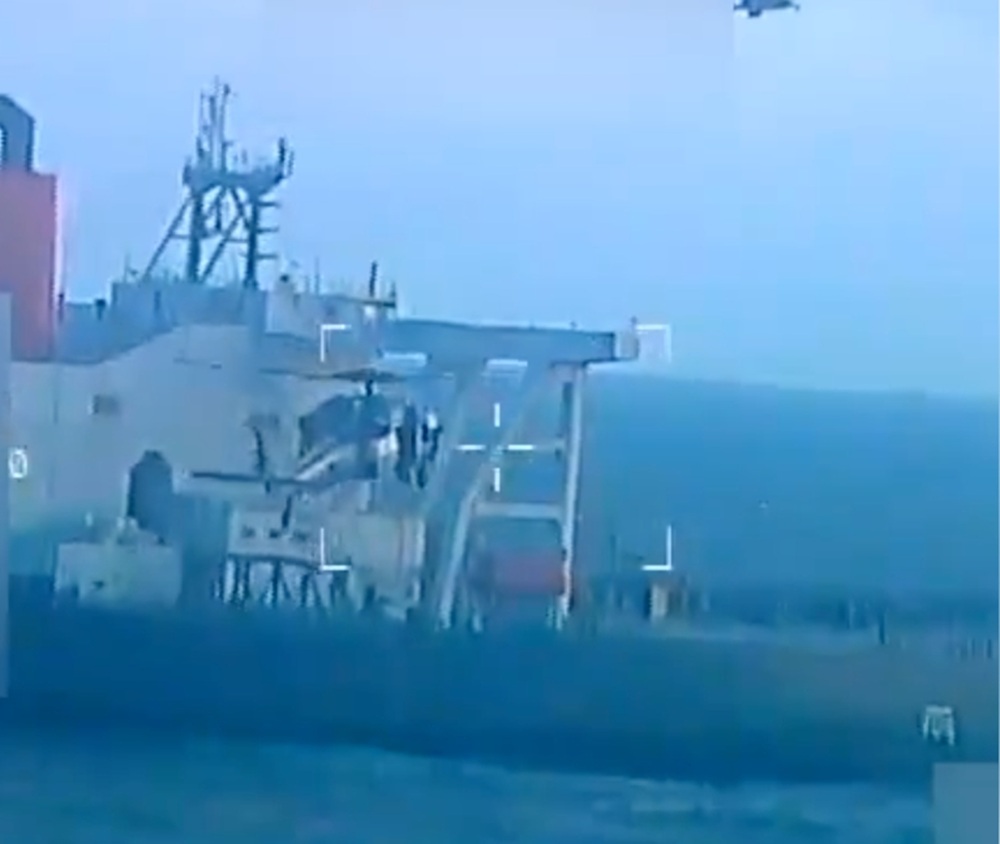 Tropas camufladas se despliegan a lo ancho del buque, con las armas preparadas, avanzan hacia la superestructura, aseguran los accesos y avanzan hacia el puente. Una segunda plataforma aérea filma la escena, lo que sugiere una cuidadosa planificación de la entrada y la intención de producir una secuencia de gran visibilidad tanto para el público estadounidense como para los gobiernos extranjeros.