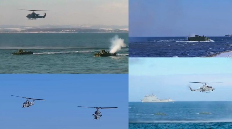Helicópteros de ataque turcos AH-1W Super Cobra despegaron desde el buque de asalto anfibio TCG Anadolu para brindar apoyo aéreo cercano durante el ejercicio de desembarco anfibio STEADFAST DART 26 de la OTAN en el área de entrenamiento de Putlos.