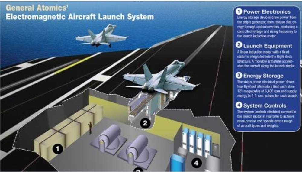 Desarrollado por General Atomics para los portaaviones de la clase Gerald R. Ford de la Armada de los Estados Unidos, el EMALS (Sistema Eléctrico Móvil de Lanzamiento) ofrece diversas ventajas sobre una catapulta de vapor. Basado en un motor de inducción lineal, permite el lanzamiento de aeronaves más pesadas, aumenta la frecuencia de lanzamientos y reduce el estrés mecánico. Todo ello con un mantenimiento reducido.
